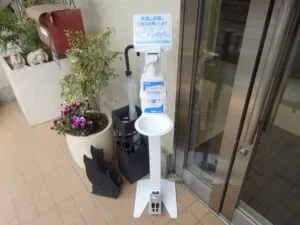 入口に新しく足踏み式消毒液を設置しました。手で押さずに消毒液が出て来るので便利です。