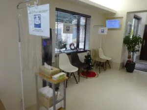 受付台・給茶機の上・待合奥にも消毒液を置いていますのでご自由にお使い下さい。
