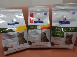 ねこちゃんの場合だと、尿のケアとストレスを軽減してくれるメタボユリナリーコンフォートや、わんちゃんと一緒で尿をケアしてくれるメタボユリナリーがあります。