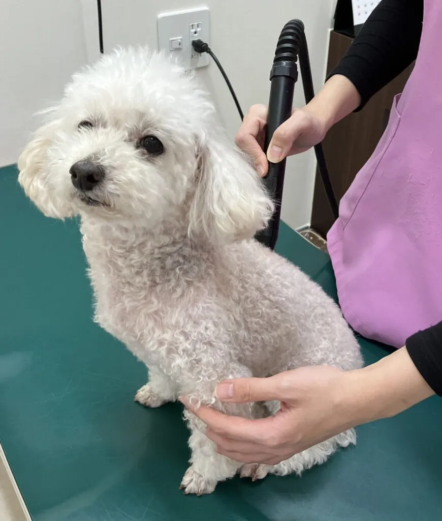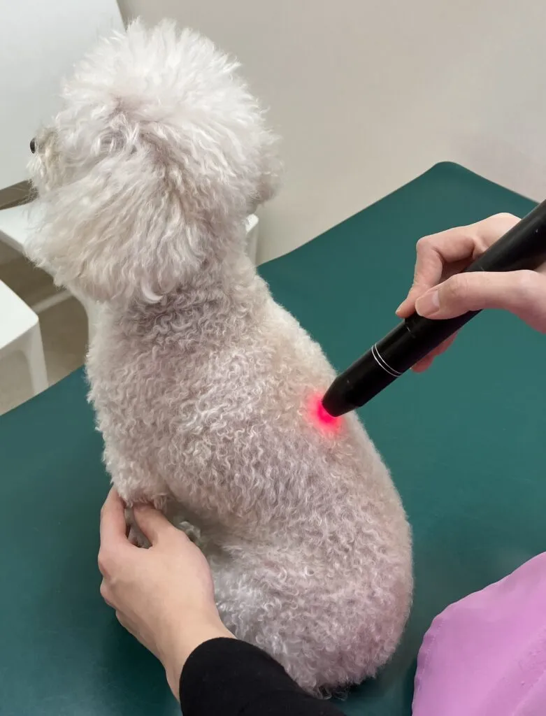 レーザー照射は痛みを伴わないので、麻酔もいらずわんちゃんやねこちゃんへのストレスが少ない治療です